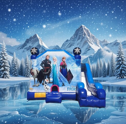 Let it go and let the magic begin with the **Frozen Double Lane Water Slide with Bounce House** rental! Join Elsa, Anna, Olaf, Kristoff, Sven, and the whole enchanting Arendelle crew in this icy, Disney-licensed combo that's perfect for winter wonderland parties or year-round frozen fun. This thrilling water slide bounce house features a spacious jumping area for endless bouncing, interactive pop-up obstacles to spark imagination, a fun basketball hoop for friendly games, a safe climbing wall to build excitement, and twin high-speed racing lanes down the double water slide that plunge into a refreshing splash pool. Ideal for Frozen-themed birthdays, princess parties, school events, family gatherings, holiday celebrations, and any occasion where kids want to feel like they're in the magical world of Arendelle.